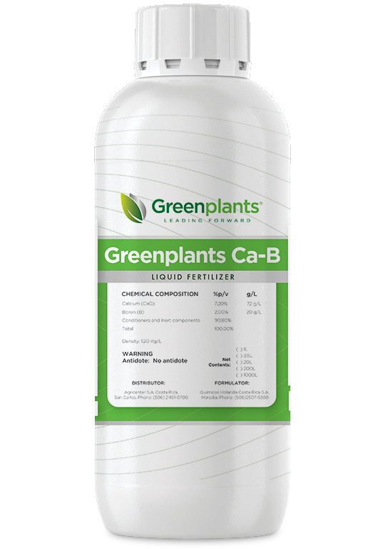 Greenplants Ca-B is a chelated fertilizer, for foliar application, indicated for mineral nutrition with calcium and boron for all crops. It activates plant growth, helps translocate nutrients in the plant, reduces the fall of leaves, flowers and fruit, and increases plant resistance to plagues, diseases and stress for lack of water.