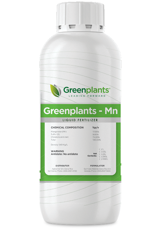 Greenplants Mn is specially formulated to treat all symptoms of deficiencies, whether by direct application to the soil or by foliar spraying. The contribution of manganese is essential for most crops, as it intervenes in numerous plant metabolic processes, participating in enzymatic systems of oxidation-reduction, in photosynthesis, as well as in the synthesis of proteins and sugar formation