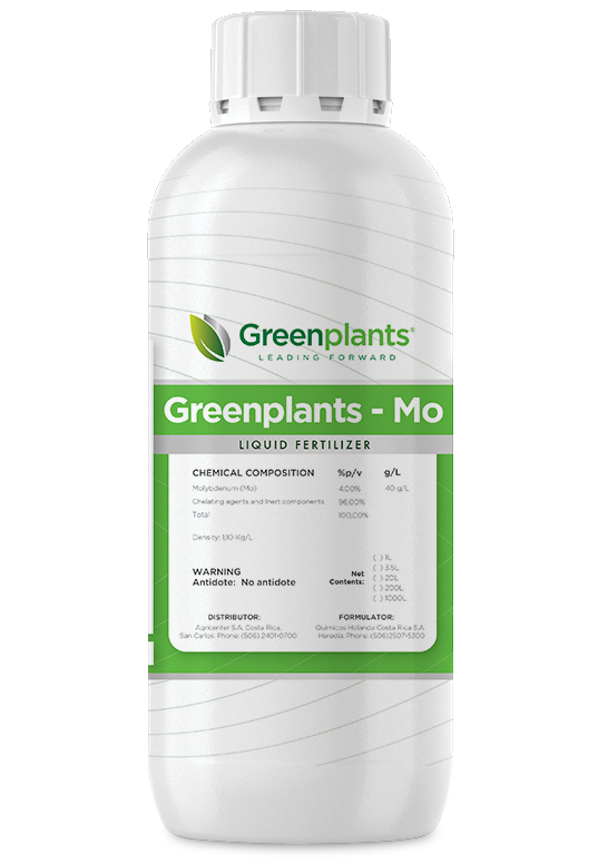 It favors absorption and translocation of iron in plants. Its deficiency is similar to that of nitrogen, presenting chlorosis in adult leaves, associated with necrotic spots when there is a severe deficiency. Greenplants-Mo provides elemental molybdenum that forms part of the nitrate reductase enzyme that reduces nitrate ions to nitrite, although it may also help in purine degradation, such as adenine and guanine, due to it need as part of the xanthine dehydrogenase enzyme (Mendel and Muller, 1976; Perez Vicente etal., 1998).