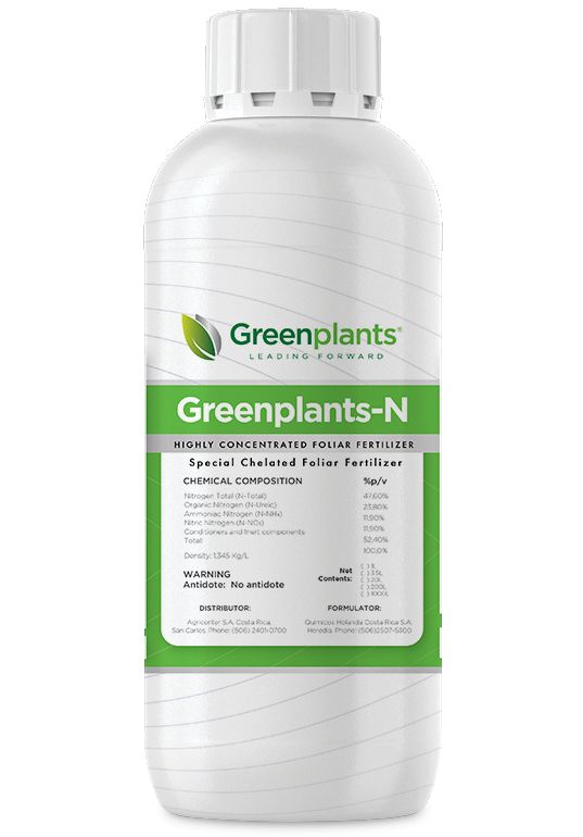 Greenplants-N es un Fertilizante Nitrogenado líquido de uso Múltiple Radicular y Foliar. En Fertirrigación un litro por metro cúbico de agua aporta: 500 ppm de N Total en sus tres formas. Por vía Foliar aplicar 500cc por 100 litros cuando se presenten deficiencias marcadas. En aplicaciones aéreas para cualquier cultivo con carencias de N aplicar 3 litros por hectárea. Es compatible con Plaguicidas y otros fertilizantes, sin embargo, se recomiendan efectuar siempre pruebas de compatibilidad.